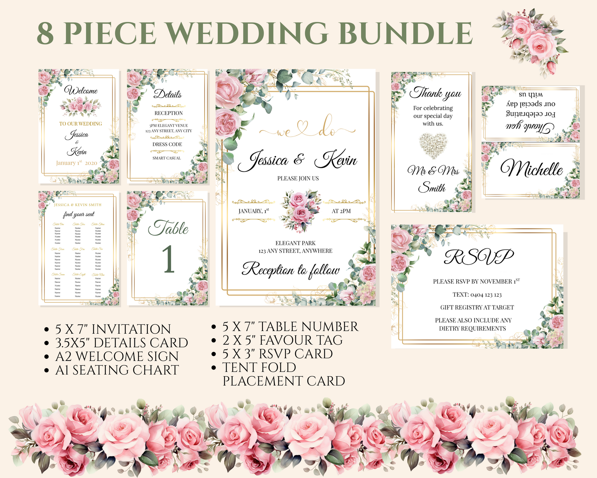 Say "I do" to effortless elegance with our 8 Piece Editable Wedding Bundle β the perfect all-in-one printable set for your big day! Designed with delicate blush pink roses and classic gold accents, this collection adds a romantic, timeless touch to your celebration.
