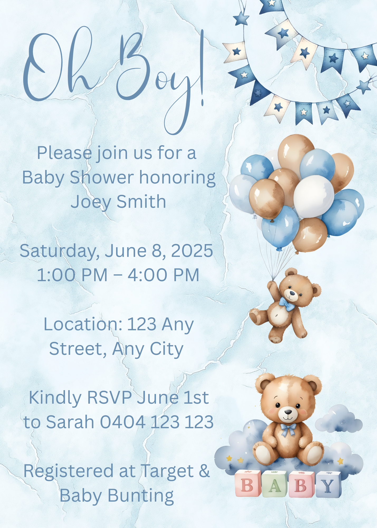 Alright, parents-to-be (or party planner extraordinaire!), get ready to shower that sweet little cub with love! We've got the paw-fect invitation to announce your upcoming Boy Teddy Baby Shower: the Editable Boy Teddy Baby Shower Invitation!